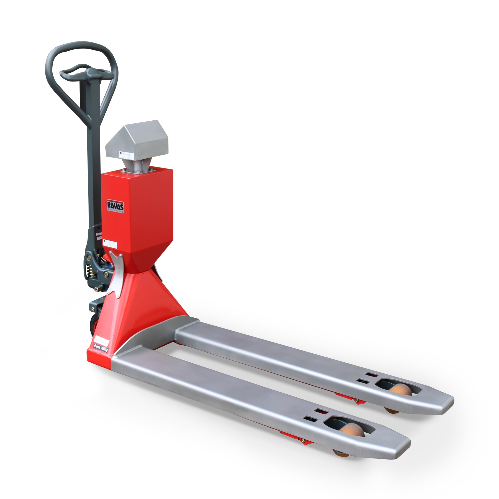 The RAVAS 256X is an FM-certified, explosion-proof hand pallet jack scale with stainless steel fork shoes, designed for harsh conditions like corrosive environments, extreme temperatures, and heavy loads.